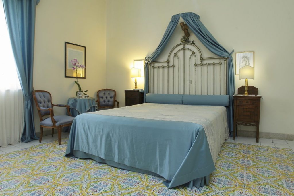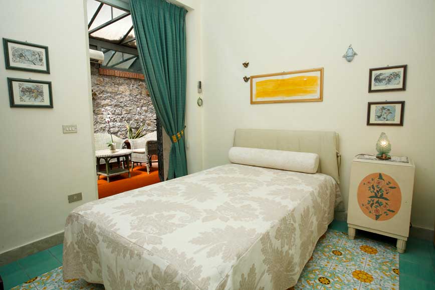 Arredata in stile siciliano con pavimenti di maiolica di Caltagirone decorata a mano, comodino in legno dipinto a mano, bajour liberty e armadio di legno in stile siciliano,è dotata di letto flou alla francese (1 piazza e mezzo) in pelle. Si affaccia sul retro del Giardino della villa tramite un Giardino d’inverno indipendente con mura in pietra e pavimenti di cotto e allestito con piante grasse ornamentali.