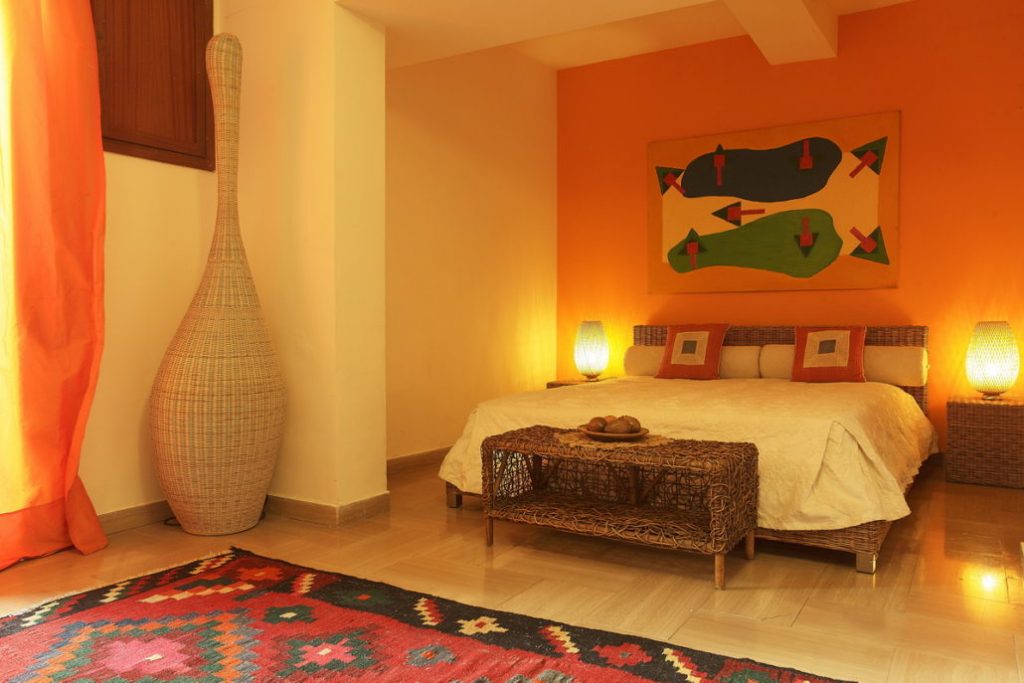 Arredata in stile moderno con mobili di design Gervasoni realizzati in materiali naturali: letto matrimoniale,comodini,cassettone,lampada da terra e armadio in legno naturale intrecciato e tappeto kilim intrecciato a mano. Presenta un secondo letto/dormeuse singolo in pelle per avere all’occorrenza un’ulteriore posto letto aggiuntivo. Si affaccia sul giardino d’inverno