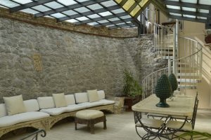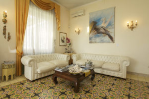 Il luminoso salone, dai materiali originali, sfoggia un elegante camino in marmo, comodi divani capitonné in pelle, delicati tendaggi di chiffon di seta ed una pregiata pavimentazione di maioliche d’epoca interamente decorate a mano. Dal suo terrazzo: da un lato il panorama mozza- fiato della Baia di Giardini-Naxos che si specchia sul Mar Mediterraneo, dall’altro la suggestiva Chiesa del XII sec., scolpita nella roccia, della Madonna della Rocca e l’incantevole borgo medioevale di Castelmola.