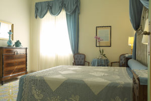 Le camere da letto – 4 matrimoniali ed 1 singola, per un totale di 9 + 1 posti letto – sono collocate in ambedue i piani della struttura. Tutte indipendenti, dotate di bagno in camera e aria condizionata caldo/freddo, con controllo autonomo della temperatura, presentano pavimentazione in marmo bianco o maioliche di Caltagirone decorate a mano. Arredate elegantemente con tessuti, tendaggi e mobili pregevoli, hanno letti “Flou” di altissima qualità e comfort, rivestiti in pelle o in seta, con sommier a doghe in legno e materassi anallergici.